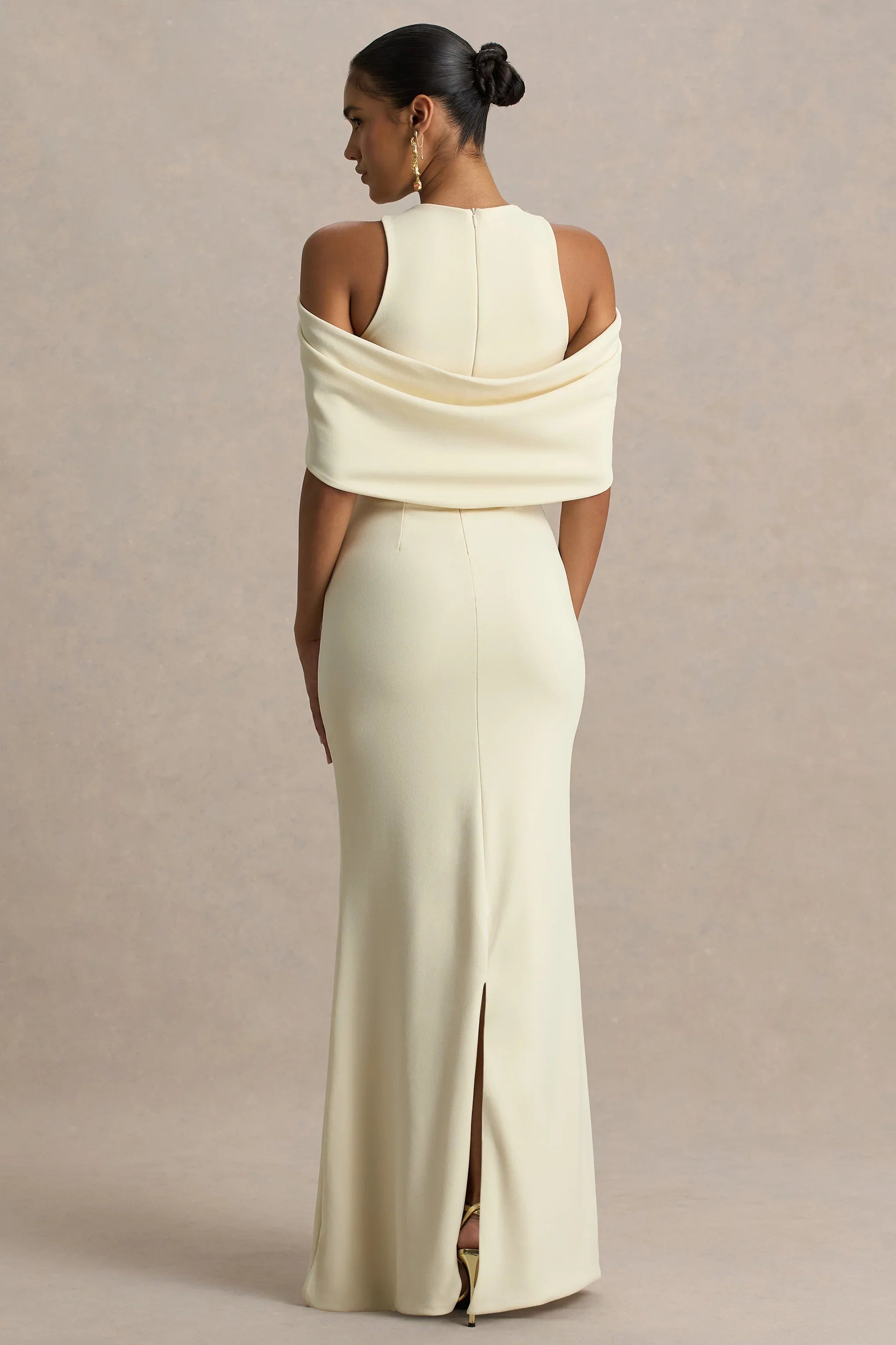 Step into elegance with Yulia, a timeless gown designed to capture the rooms attention. Crafted in a soft sand hue of our sculpting premium scuba crepe, this gown is designed to flatter every curve. The striking gold-detailed high neckline adds a chic touch, while the pleated cape overlay drapes gracefully across the shoulders, creating drama from every angle. With a floor-sweeping maxi hem and centre-back split for effortless movement, Yulia is made for grand entrances and unforgettable exits.