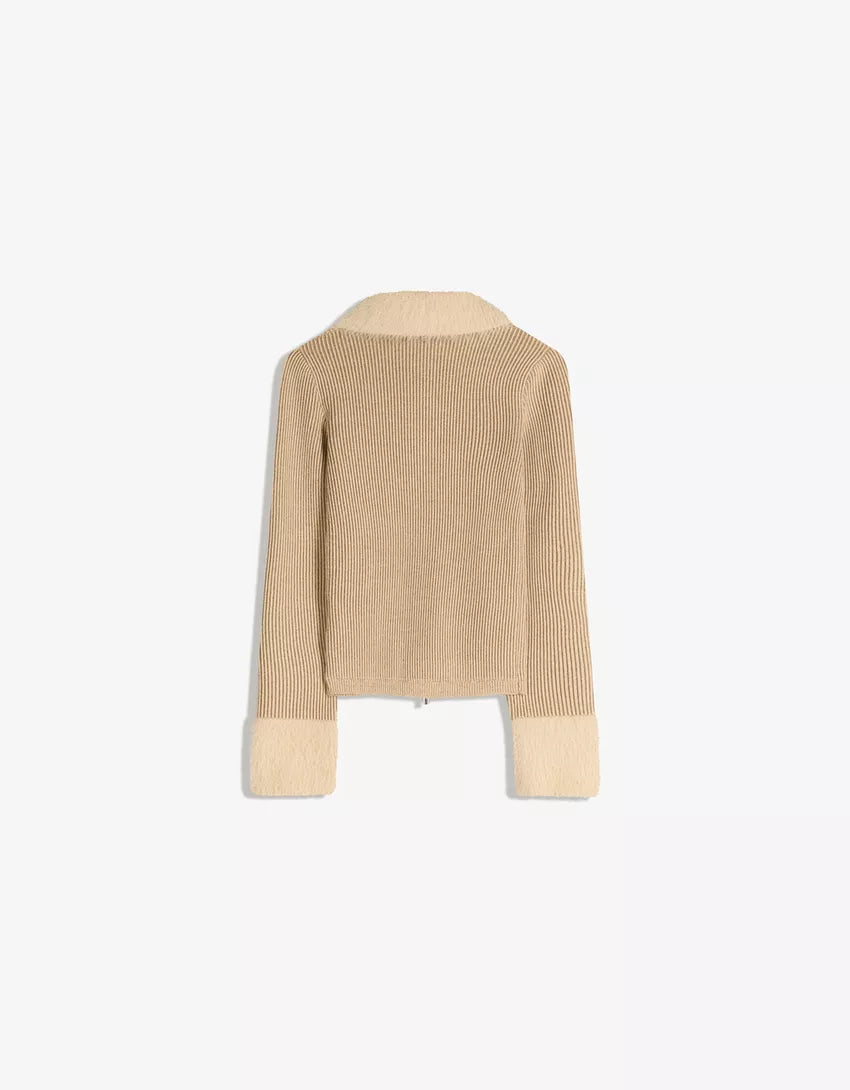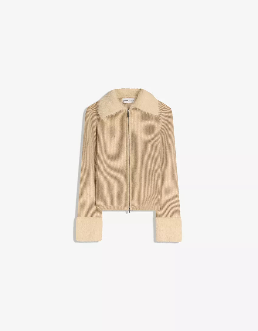 Zip-up cardigan with faux fur collar. Available in sand, dark grey.